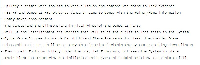 He goes on to state that a counter-coup has been initiated by members of the "intelligence community" from over a dozen agencies with the help of Wikileaks. When Comey brought the Weiner emails to light, this was: